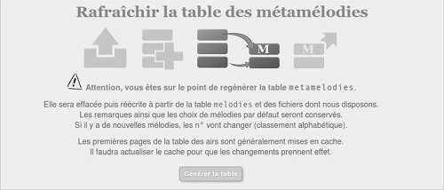 Afin que les dernières mélodies référencées soient prises en compte pour la recherche d'airs, il faut reconstruire la table des métamélodies à partir de la table des mélodies et des fichiers présents sur le serveur.