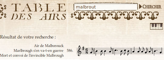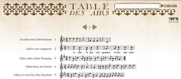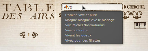 La recherche s'effectue sur les titres/premières paroles des mélodies, les éventuels compositeurs, la source (en abrégé) et les numéros d'air. On peut ainsi chercher « coeur » (avec ou sans ligature), « thomas réveille », « air 6 Clé du caveau » ou « tflo 3 »