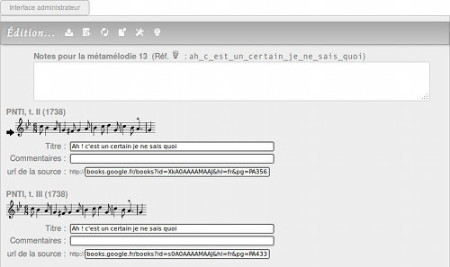 Principe : elle affiche dans un tableau les titres contenus dans la table metamelodie. Une métamélodie est ce à quoi se rapportent des titres d'air, des partitions, un compositeur etc. Elle est éventuellement complétée par une partition "moyenne" représentant ce groupe de mélodies.